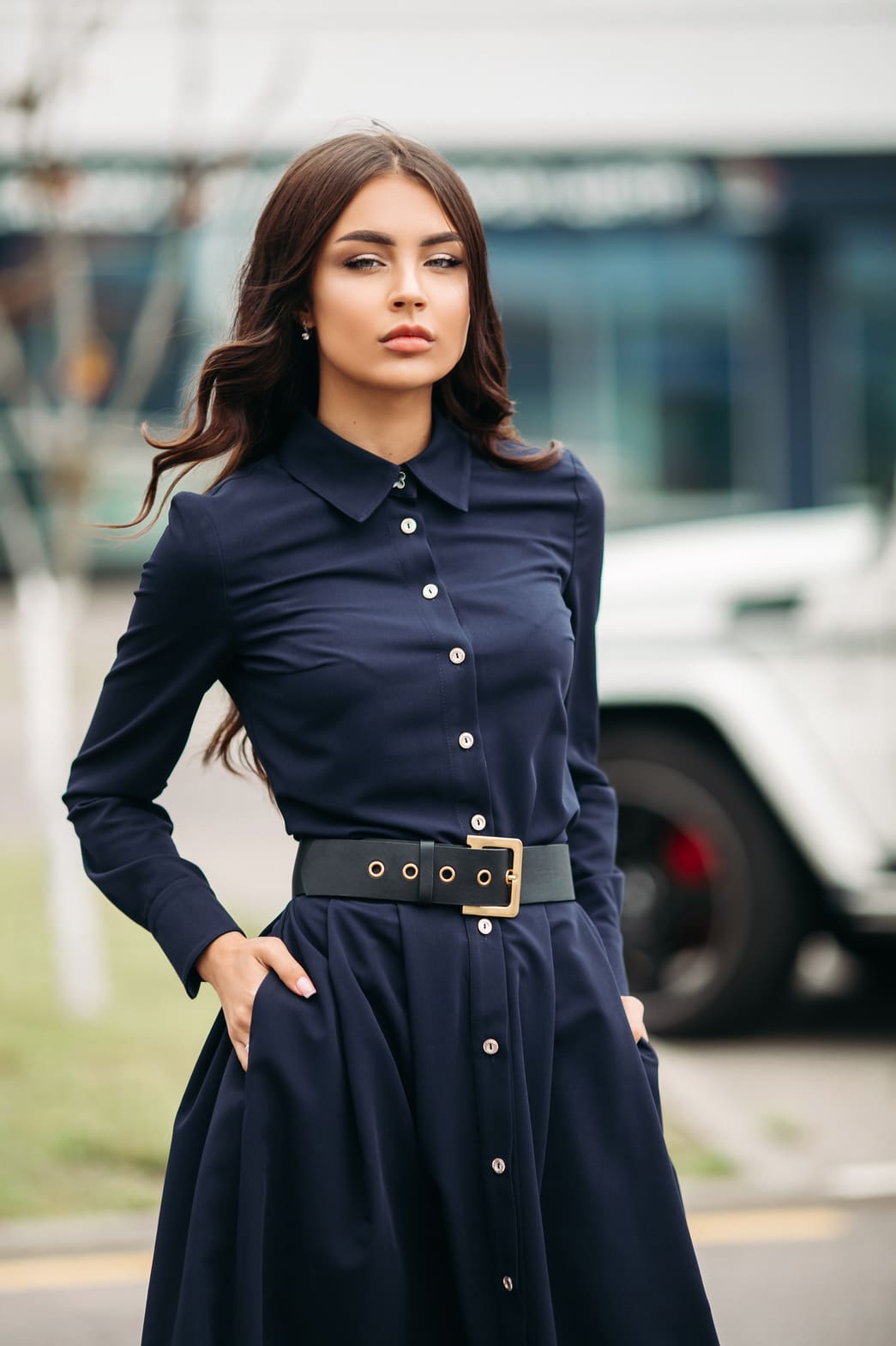 Une robe chemise bleu marine chic et structurée, parfaite pour sublimer la silhouette tout en offrant un style moderne et intemporel.
