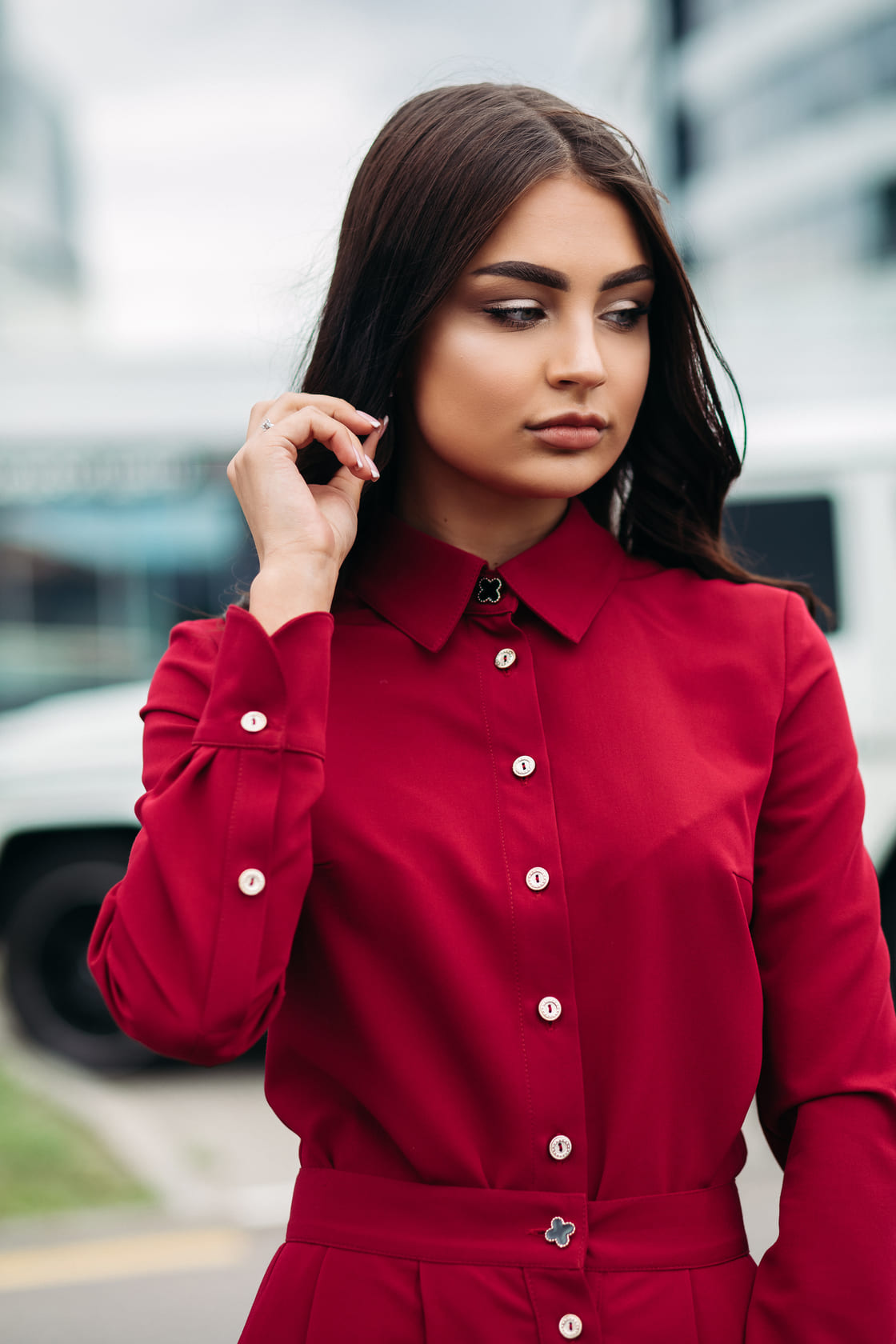 Cette robe chemise rouge séduit par son style moderne et structuré. Ses boutons contrastés et son col classique apportent une allure élégante et professionnelle.