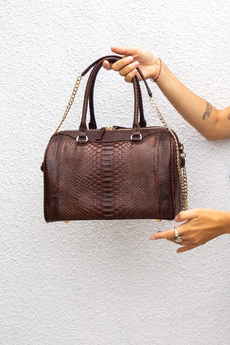 Ce sac effet python marron combine caractère et élégance. Son format bowling lui confère une grande capacité de rangement, parfaite pour les journées chargées ou les escapades.